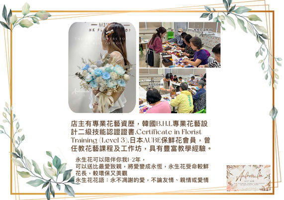店主有專業花藝資歷,韓國B.H.L專業花藝設計二級技能認證證書,Certificate in Florist Training (Level 3),日本AUBE保鮮花會員,曾任教花藝課程及工作坊,具有豐富教學經驗。