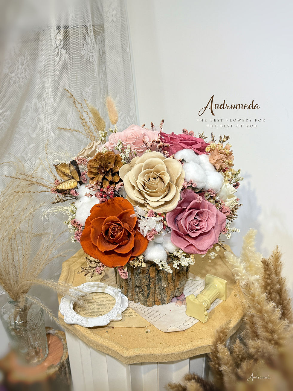 永生花復古橙&豆沙粉色系列-原木花盆